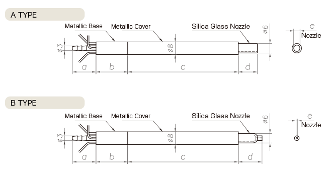 - 극 소면의 열원으로 사용할 수 있습니다.(토출구 내경 10 이하 가능)